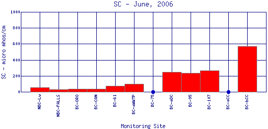 Specific Conductance is a measure of how well water can pass an electrical current. It is an indirect measure of the presence of inorganic dissolved solids, such as chloride, nitrate, sulfate, phosphate, sodium, magnesium, calcium, and iron. These substances conduct electricity because they are negatively or positively charged when dissolved in water. The concentration of dissolved solids, or the conductivity, is affected by the bedrock and soil in the watershed. It is also affected by human influences. For example, agricultural runoff can raise conductivity because of the presence of phosphate and nitrate.