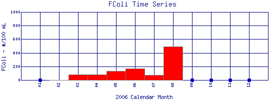 is found in the intestinal tracts of mammals. High concentrations of the bacteria in water or sludge suggest the presence of disease-causing organisms, and may be caused by septic tank failure, poor pasture and animal keeping practices, pet waste, and urban runoff. To measure fecal coliform bacteria, water samples are collected in sterilized containers, filtered, and incubated at a certain temperature. The resulting bacterial colonies that form are counted and recorded as the number of colony producing units per 100 ml of water (CPU/100 ml). Safe drinking water should have fecal coliform counts of 0 CPU/100 ml. For safe swimming, concentrations less than 200 CPU/100 ml is desirable, and for boating, less than 1000 CPU/100 ml is desirable. However, these standards may vary at the local, state, and federal level. |