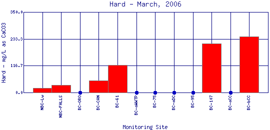 Hardness generally refers to the amount of calcium and magnesium in water. In household use, these cations (ions with a charge greater than +1) can prevent soap from sudsing and leave behind a white scum in bathtubs. In the aquatic environment, calcium and magnesium help keep fish from absorbing metals, such as lead, arsenic, and cadmium, into their bloodstream through their gills. Therefore, the harder the water, the less easy it is for toxic metals to absorb onto gills. Water in the Boulder Creek watershed is generally soft because the water comes mainly from melting snow which is low in minerals and metals.