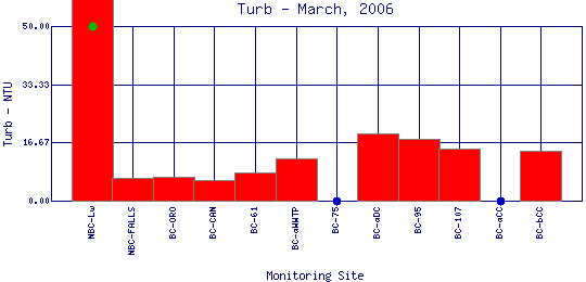 The above map indicates water quality monitoring sites. To view data at a specific site select it from the map with the mouse.