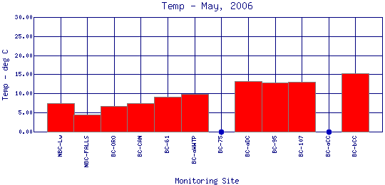 The above map indicates water quality monitoring sites. To view data at a specific site select it from the map with the mouse.
