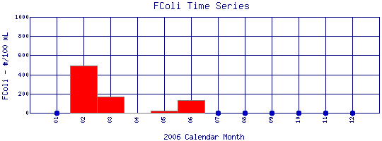 is found in the intestinal tracts of mammals. High concentrations of the bacteria in water or sludge suggest the presence of disease-causing organisms, and may be caused by septic tank failure, poor pasture and animal keeping practices, pet waste, and urban runoff. To measure fecal coliform bacteria, water samples are collected in sterilized containers, filtered, and incubated at a certain temperature. The resulting bacterial colonies that form are counted and recorded as the number of colony producing units per 100 ml of water (CPU/100 ml). Safe drinking water should have fecal coliform counts of 0 CPU/100 ml. For safe swimming, concentrations less than 200 CPU/100 ml is desirable, and for boating, less than 1000 CPU/100 ml is desirable. However, these standards may vary at the local, state, and federal level. |