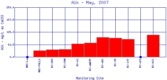 Alkalinity refers to how well a water body can neutralize acids. Alkalinity measures the amount of alkaline compounds in water, such as carbonates (CO3 2-), bicarbonates (HCO3 -), and hydroxides (OH-). These compounds are natural buffers that can remove excess hydrogen ions that have been added from sources such as acid rain or acid mine drainage. Alkalinity mitigates or relieves metals toxicity by using available HCO3 - and CO3 2- to take metals out of solution, thus making it unavailable to fish. Alkalinity is affected by the geology of the watershed; watersheds containing limestone will have a higher alkalinity than watersheds where granite is predominant. The Boulder Creek Watershed is composed primarily of granite rocks, thus the water has a lower alkalinity content.
