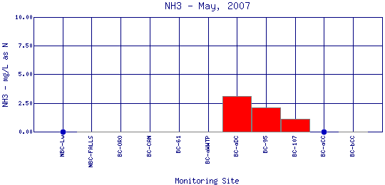 The above map indicates water quality monitoring sites. To view data at a specific site select it from the map with the mouse.