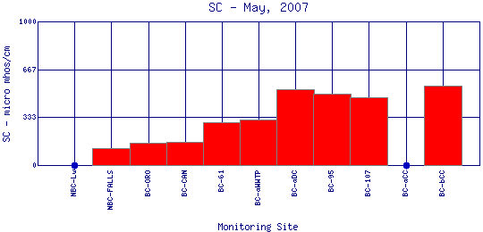 Specific Conductance is a measure of how well water can pass an electrical current. It is an indirect measure of the presence of inorganic dissolved solids, such as chloride, nitrate, sulfate, phosphate, sodium, magnesium, calcium, and iron. These substances conduct electricity because they are negatively or positively charged when dissolved in water. The concentration of dissolved solids, or the conductivity, is affected by the bedrock and soil in the watershed. It is also affected by human influences. For example, agricultural runoff can raise conductivity because of the presence of phosphate and nitrate.