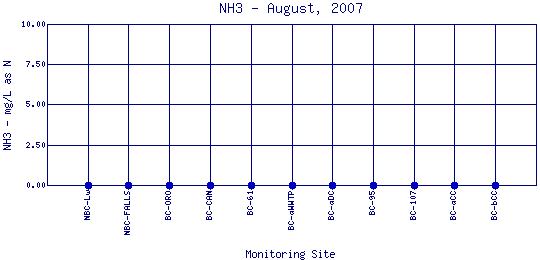 The above map indicates water quality monitoring sites. To view data at a specific site select it from the map with the mouse.