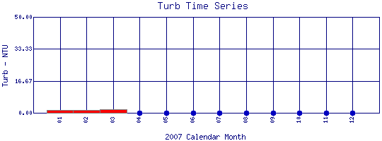 Select on the parameter name to view all Turbidity time series plots on the basin map. Select on the table date to view stream Turbidity profiles observed on that date. Select here to view all parameters at this site.