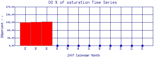 Select on the parameter name to view all DO Percent of Saturation time series plots on the basin map. Select on the table date to view stream DO Percent of Saturation profiles observed on that date. Select here to view all parameters at this site.