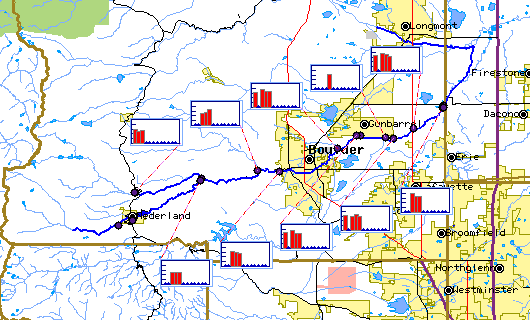pH measures hydrogen concentration in water. pH is presented on a scale from 0 to 14. A solution with a pH value of 7 is neutral; a solution with a pH value less than 7 is acidic; a solution with a pH value greater than 7 is basic. Natural waters usually have a pH between 6 and 9. The scale is negatively logarithmic, so each whole number (reading downward) is ten times the preceding one (for example, pH 5.5 is 100 times as acidic as pH 7.5). The pH of natural waters can be made acidic or basic by human activities. For example, coal-burning power plants and heavy automobile traffic can produce nitrous oxides and sulfur dioxide, making the rain and snow highly acidic. | |||||||||