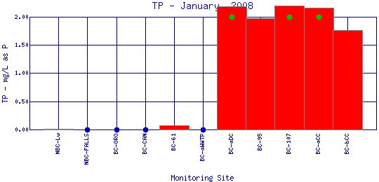 The above map indicates water quality monitoring sites. To view data at a specific site select it from the map with the mouse.