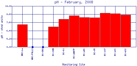 pH measures hydrogen concentration in water. pH is presented on a scale from 0 to 14. A solution with a pH value of 7 is neutral; a solution with a pH value less than 7 is acidic; a solution with a pH value greater than 7 is basic. Natural waters usually have a pH between 6 and 9. The scale is negatively logarithmic, so each whole number (reading downward) is ten times the preceding one (for example, pH 5.5 is 100 times as acidic as pH 7.5). The pH of natural waters can be made acidic or basic by human activities. For example, coal-burning power plants and heavy automobile traffic can produce nitrous oxides and sulfur dioxide, making the rain and snow highly acidic.