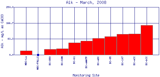 Alkalinity refers to how well a water body can neutralize acids. Alkalinity measures the amount of alkaline compounds in water, such as carbonates (CO3 2-), bicarbonates (HCO3 -), and hydroxides (OH-). These compounds are natural buffers that can remove excess hydrogen ions that have been added from sources such as acid rain or acid mine drainage. Alkalinity mitigates or relieves metals toxicity by using available HCO3 - and CO3 2- to take metals out of solution, thus making it unavailable to fish. Alkalinity is affected by the geology of the watershed; watersheds containing limestone will have a higher alkalinity than watersheds where granite is predominant. The Boulder Creek Watershed is composed primarily of granite rocks, thus the water has a lower alkalinity content.