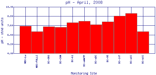 pH measures hydrogen concentration in water. pH is presented on a scale from 0 to 14. A solution with a pH value of 7 is neutral; a solution with a pH value less than 7 is acidic; a solution with a pH value greater than 7 is basic. Natural waters usually have a pH between 6 and 9. The scale is negatively logarithmic, so each whole number (reading downward) is ten times the preceding one (for example, pH 5.5 is 100 times as acidic as pH 7.5). The pH of natural waters can be made acidic or basic by human activities. For example, coal-burning power plants and heavy automobile traffic can produce nitrous oxides and sulfur dioxide, making the rain and snow highly acidic. | ||||||||||||||||||||||||||||||||||||||||||