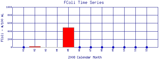 is found in the intestinal tracts of mammals. High concentrations of the bacteria in water or sludge suggest the presence of disease-causing organisms, and may be caused by septic tank failure, poor pasture and animal keeping practices, pet waste, and urban runoff. To measure fecal coliform bacteria, water samples are collected in sterilized containers, filtered, and incubated at a certain temperature. The resulting bacterial colonies that form are counted and recorded as the number of colony producing units per 100 ml of water (CPU/100 ml). Safe drinking water should have fecal coliform counts of 0 CPU/100 ml. For safe swimming, concentrations less than 200 CPU/100 ml is desirable, and for boating, less than 1000 CPU/100 ml is desirable. However, these standards may vary at the local, state, and federal level. |