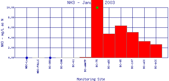 The above map indicates water quality monitoring sites. To view data at a specific site select it from the map with the mouse.