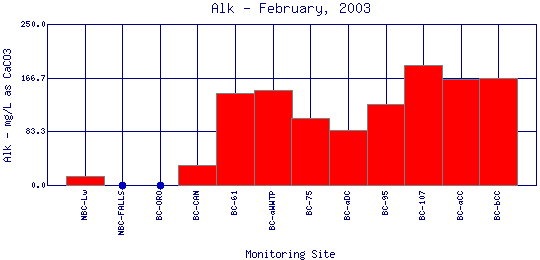 Alkalinity refers to how well a water body can neutralize acids. Alkalinity measures the amount of alkaline compounds in water, such as carbonates (CO3 2-), bicarbonates (HCO3 -), and hydroxides (OH-). These compounds are natural buffers that can remove excess hydrogen ions that have been added from sources such as acid rain or acid mine drainage. Alkalinity mitigates or relieves metals toxicity by using available HCO3 - and CO3 2- to take metals out of solution, thus making it unavailable to fish. Alkalinity is affected by the geology of the watershed; watersheds containing limestone will have a higher alkalinity than watersheds where granite is predominant. The Boulder Creek Watershed is composed primarily of granite rocks, thus the water has a lower alkalinity content.