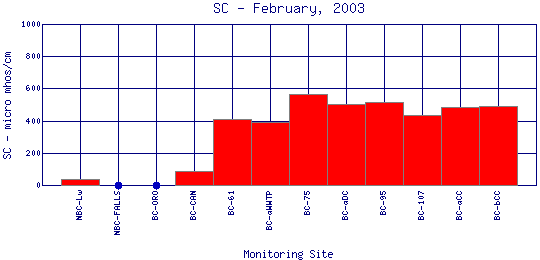 Specific Conductance is a measure of how well water can pass an electrical current. It is an indirect measure of the presence of inorganic dissolved solids, such as chloride, nitrate, sulfate, phosphate, sodium, magnesium, calcium, and iron. These substances conduct electricity because they are negatively or positively charged when dissolved in water. The concentration of dissolved solids, or the conductivity, is affected by the bedrock and soil in the watershed. It is also affected by human influences. For example, agricultural runoff can raise conductivity because of the presence of phosphate and nitrate.