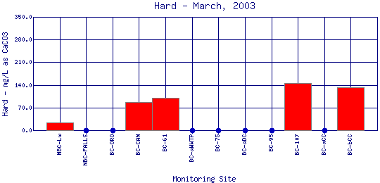 Hardness generally refers to the amount of calcium and magnesium in water. In household use, these cations (ions with a charge greater than +1) can prevent soap from sudsing and leave behind a white scum in bathtubs. In the aquatic environment, calcium and magnesium help keep fish from absorbing metals, such as lead, arsenic, and cadmium, into their bloodstream through their gills. Therefore, the harder the water, the less easy it is for toxic metals to absorb onto gills. Water in the Boulder Creek watershed is generally soft because the water comes mainly from melting snow which is low in minerals and metals.