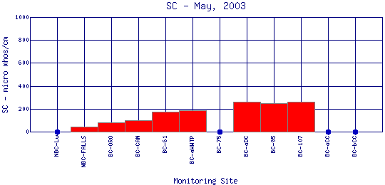 Specific Conductance is a measure of how well water can pass an electrical current. It is an indirect measure of the presence of inorganic dissolved solids, such as chloride, nitrate, sulfate, phosphate, sodium, magnesium, calcium, and iron. These substances conduct electricity because they are negatively or positively charged when dissolved in water. The concentration of dissolved solids, or the conductivity, is affected by the bedrock and soil in the watershed. It is also affected by human influences. For example, agricultural runoff can raise conductivity because of the presence of phosphate and nitrate.