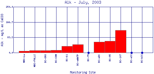 Alkalinity refers to how well a water body can neutralize acids. Alkalinity measures the amount of alkaline compounds in water, such as carbonates (CO3 2-), bicarbonates (HCO3 -), and hydroxides (OH-). These compounds are natural buffers that can remove excess hydrogen ions that have been added from sources such as acid rain or acid mine drainage. Alkalinity mitigates or relieves metals toxicity by using available HCO3 - and CO3 2- to take metals out of solution, thus making it unavailable to fish. Alkalinity is affected by the geology of the watershed; watersheds containing limestone will have a higher alkalinity than watersheds where granite is predominant. The Boulder Creek Watershed is composed primarily of granite rocks, thus the water has a lower alkalinity content.