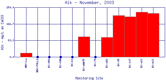 Alkalinity refers to how well a water body can neutralize acids. Alkalinity measures the amount of alkaline compounds in water, such as carbonates (CO3 2-), bicarbonates (HCO3 -), and hydroxides (OH-). These compounds are natural buffers that can remove excess hydrogen ions that have been added from sources such as acid rain or acid mine drainage. Alkalinity mitigates or relieves metals toxicity by using available HCO3 - and CO3 2- to take metals out of solution, thus making it unavailable to fish. Alkalinity is affected by the geology of the watershed; watersheds containing limestone will have a higher alkalinity than watersheds where granite is predominant. The Boulder Creek Watershed is composed primarily of granite rocks, thus the water has a lower alkalinity content.