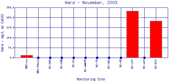 Hardness generally refers to the amount of calcium and magnesium in water. In household use, these cations (ions with a charge greater than +1) can prevent soap from sudsing and leave behind a white scum in bathtubs. In the aquatic environment, calcium and magnesium help keep fish from absorbing metals, such as lead, arsenic, and cadmium, into their bloodstream through their gills. Therefore, the harder the water, the less easy it is for toxic metals to absorb onto gills. Water in the Boulder Creek watershed is generally soft because the water comes mainly from melting snow which is low in minerals and metals. | |||||||||||||||||||||||||||||||||||||||||||||
