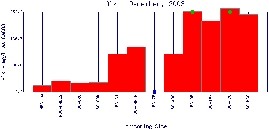 Alkalinity refers to how well a water body can neutralize acids. Alkalinity measures the amount of alkaline compounds in water, such as carbonates (CO3 2-), bicarbonates (HCO3 -), and hydroxides (OH-). These compounds are natural buffers that can remove excess hydrogen ions that have been added from sources such as acid rain or acid mine drainage. Alkalinity mitigates or relieves metals toxicity by using available HCO3 - and CO3 2- to take metals out of solution, thus making it unavailable to fish. Alkalinity is affected by the geology of the watershed; watersheds containing limestone will have a higher alkalinity than watersheds where granite is predominant. The Boulder Creek Watershed is composed primarily of granite rocks, thus the water has a lower alkalinity content.