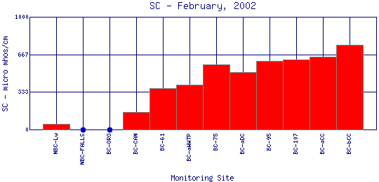 Specific Conductance is a measure of how well water can pass an electrical current. It is an indirect measure of the presence of inorganic dissolved solids, such as chloride, nitrate, sulfate, phosphate, sodium, magnesium, calcium, and iron. These substances conduct electricity because they are negatively or positively charged when dissolved in water. The concentration of dissolved solids, or the conductivity, is affected by the bedrock and soil in the watershed. It is also affected by human influences. For example, agricultural runoff can raise conductivity because of the presence of phosphate and nitrate.
