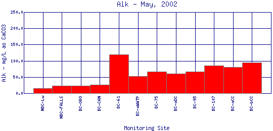 Alkalinity refers to how well a water body can neutralize acids. Alkalinity measures the amount of alkaline compounds in water, such as carbonates (CO3 2-), bicarbonates (HCO3 -), and hydroxides (OH-). These compounds are natural buffers that can remove excess hydrogen ions that have been added from sources such as acid rain or acid mine drainage. Alkalinity mitigates or relieves metals toxicity by using available HCO3 - and CO3 2- to take metals out of solution, thus making it unavailable to fish. Alkalinity is affected by the geology of the watershed; watersheds containing limestone will have a higher alkalinity than watersheds where granite is predominant. The Boulder Creek Watershed is composed primarily of granite rocks, thus the water has a lower alkalinity content.