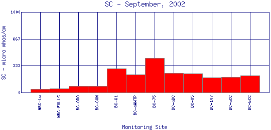 Specific Conductance is a measure of how well water can pass an electrical current. It is an indirect measure of the presence of inorganic dissolved solids, such as chloride, nitrate, sulfate, phosphate, sodium, magnesium, calcium, and iron. These substances conduct electricity because they are negatively or positively charged when dissolved in water. The concentration of dissolved solids, or the conductivity, is affected by the bedrock and soil in the watershed. It is also affected by human influences. For example, agricultural runoff can raise conductivity because of the presence of phosphate and nitrate.