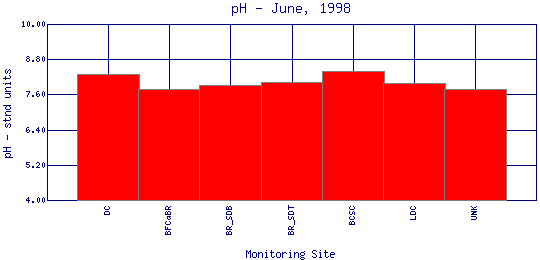 pH measures hydrogen concentration in water. pH is presented on a scale from 0 to 14. A solution with a pH value of 7 is neutral; a solution with a pH value less than 7 is acidic; a solution with a pH value greater than 7 is basic. Natural waters usually have a pH between 6 and 9. The scale is negatively logarithmic, so each whole number (reading downward) is ten times the preceding one (for example, pH 5.5 is 100 times as acidic as pH 7.5). The pH of natural waters can be made acidic or basic by human activities. For example, coal-burning power plants and heavy automobile traffic can produce nitrous oxides and sulfur dioxide, making the rain and snow highly acidic.