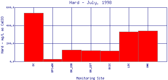Hardness generally refers to the amount of calcium and magnesium in water. In household use, these cations (ions with a charge greater than +1) can prevent soap from sudsing and leave behind a white scum in bathtubs. In the aquatic environment, calcium and magnesium help keep fish from absorbing metals, such as lead, arsenic, and cadmium, into their bloodstream through their gills. Therefore, the harder the water, the less easy it is for toxic metals to absorb onto gills. Water in the Boulder Creek watershed is generally soft because the water comes mainly from melting snow which is low in minerals and metals. | ||||||||||||||||||||||||||||||