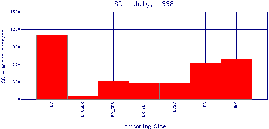 Specific Conductance is a measure of how well water can pass an electrical current. It is an indirect measure of the presence of inorganic dissolved solids, such as chloride, nitrate, sulfate, phosphate, sodium, magnesium, calcium, and iron. These substances conduct electricity because they are negatively or positively charged when dissolved in water. The concentration of dissolved solids, or the conductivity, is affected by the bedrock and soil in the watershed. It is also affected by human influences. For example, agricultural runoff can raise conductivity because of the presence of phosphate and nitrate.