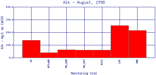 Alkalinity refers to how well a water body can neutralize acids. Alkalinity measures the amount of alkaline compounds in water, such as carbonates (CO3 2-), bicarbonates (HCO3 -), and hydroxides (OH-). These compounds are natural buffers that can remove excess hydrogen ions that have been added from sources such as acid rain or acid mine drainage. Alkalinity mitigates or relieves metals toxicity by using available HCO3 - and CO3 2- to take metals out of solution, thus making it unavailable to fish. Alkalinity is affected by the geology of the watershed; watersheds containing limestone will have a higher alkalinity than watersheds where granite is predominant. The Boulder Creek Watershed is composed primarily of granite rocks, thus the water has a lower alkalinity content.