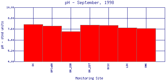 pH measures hydrogen concentration in water. pH is presented on a scale from 0 to 14. A solution with a pH value of 7 is neutral; a solution with a pH value less than 7 is acidic; a solution with a pH value greater than 7 is basic. Natural waters usually have a pH between 6 and 9. The scale is negatively logarithmic, so each whole number (reading downward) is ten times the preceding one (for example, pH 5.5 is 100 times as acidic as pH 7.5). The pH of natural waters can be made acidic or basic by human activities. For example, coal-burning power plants and heavy automobile traffic can produce nitrous oxides and sulfur dioxide, making the rain and snow highly acidic.