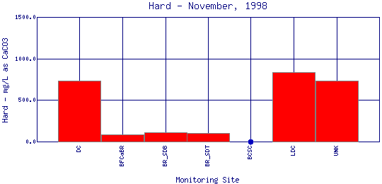 Hardness generally refers to the amount of calcium and magnesium in water. In household use, these cations (ions with a charge greater than +1) can prevent soap from sudsing and leave behind a white scum in bathtubs. In the aquatic environment, calcium and magnesium help keep fish from absorbing metals, such as lead, arsenic, and cadmium, into their bloodstream through their gills. Therefore, the harder the water, the less easy it is for toxic metals to absorb onto gills. Water in the Boulder Creek watershed is generally soft because the water comes mainly from melting snow which is low in minerals and metals. | ||||||||||||||||||||||||||||||