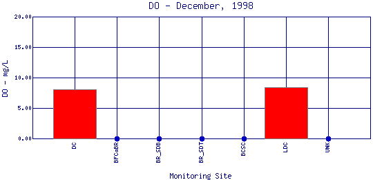 Dissolved Oxygen (DO) is the amount of oxygen dissolved in the water. DO is a very important indicator of a water body's ability to support aquatic life. The amount of DO in water depends on several factors, including temperature (the colder the water, the more oxygen can be dissolved); the volume and velocity of water flowing in the water body; and the amount of organisms using oxygen for respiration. The amount of oxygen dissolved in water is expressed as a concentration, in milligrams per liter (mg/l) of water. The optimal DO for adult brown trout is 9-12 mg/l. Human activities that affect DO levels include the removal of riparian vegetation, runoff from roads, and sewage discharge.