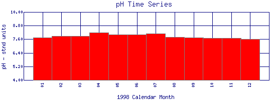 measures hydrogen concentration in water. pH is presented on a scale from 0 to 14. A solution with a pH value of 7 is neutral; a solution with a pH value less than 7 is acidic; a solution with a pH value greater than 7 is basic. Natural waters usually have a pH between 6 and 9. The scale is negatively logarithmic, so each whole number (reading downward) is ten times the preceding one (for example, pH 5.5 is 100 times as acidic as pH 7.5). The pH of natural waters can be made acidic or basic by human activities. For example, coal-burning power plants and heavy automobile traffic can produce nitrous oxides and sulfur dioxide, making the rain and snow highly acidic. |