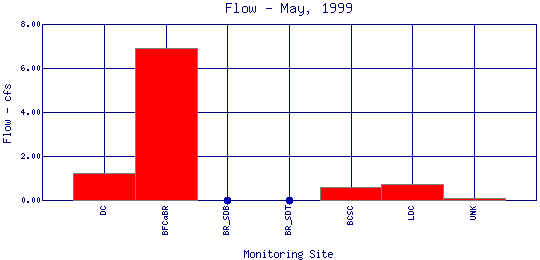 Flow is the volume of water moving past a point in a unit of time. Two things make up flow: the volume of water in the stream, and the velocity of the water moving past a given point. Flow affects the concentration of dissolved oxygen, natural substances, and pollutants in a water body. Flow is measured in units of cubic feet per second (cfs). Peak flows for Boulder Creek in the spring can reach as high as 300-800 cfs and as low as 10-50 cfs in the fall months.