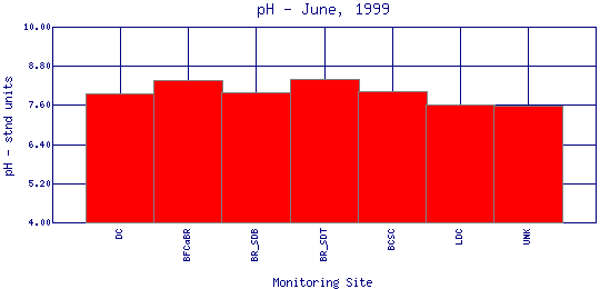 pH measures hydrogen concentration in water. pH is presented on a scale from 0 to 14. A solution with a pH value of 7 is neutral; a solution with a pH value less than 7 is acidic; a solution with a pH value greater than 7 is basic. Natural waters usually have a pH between 6 and 9. The scale is negatively logarithmic, so each whole number (reading downward) is ten times the preceding one (for example, pH 5.5 is 100 times as acidic as pH 7.5). The pH of natural waters can be made acidic or basic by human activities. For example, coal-burning power plants and heavy automobile traffic can produce nitrous oxides and sulfur dioxide, making the rain and snow highly acidic.