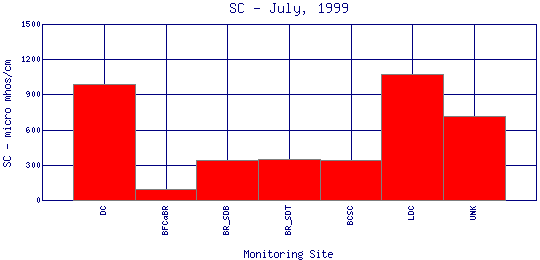Specific Conductance is a measure of how well water can pass an electrical current. It is an indirect measure of the presence of inorganic dissolved solids, such as chloride, nitrate, sulfate, phosphate, sodium, magnesium, calcium, and iron. These substances conduct electricity because they are negatively or positively charged when dissolved in water. The concentration of dissolved solids, or the conductivity, is affected by the bedrock and soil in the watershed. It is also affected by human influences. For example, agricultural runoff can raise conductivity because of the presence of phosphate and nitrate.