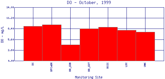 Dissolved Oxygen (DO) is the amount of oxygen dissolved in the water. DO is a very important indicator of a water body's ability to support aquatic life. The amount of DO in water depends on several factors, including temperature (the colder the water, the more oxygen can be dissolved); the volume and velocity of water flowing in the water body; and the amount of organisms using oxygen for respiration. The amount of oxygen dissolved in water is expressed as a concentration, in milligrams per liter (mg/l) of water. The optimal DO for adult brown trout is 9-12 mg/l. Human activities that affect DO levels include the removal of riparian vegetation, runoff from roads, and sewage discharge.