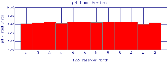 measures hydrogen concentration in water. pH is presented on a scale from 0 to 14. A solution with a pH value of 7 is neutral; a solution with a pH value less than 7 is acidic; a solution with a pH value greater than 7 is basic. Natural waters usually have a pH between 6 and 9. The scale is negatively logarithmic, so each whole number (reading downward) is ten times the preceding one (for example, pH 5.5 is 100 times as acidic as pH 7.5). The pH of natural waters can be made acidic or basic by human activities. For example, coal-burning power plants and heavy automobile traffic can produce nitrous oxides and sulfur dioxide, making the rain and snow highly acidic. |
