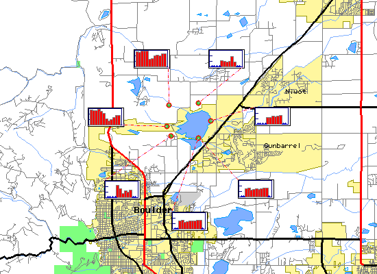 Hardness generally refers to the amount of calcium and magnesium in water. In household use, these cations (ions with a charge greater than +1) can prevent soap from sudsing and leave behind a white scum in bathtubs. In the aquatic environment, calcium and magnesium help keep fish from absorbing metals, such as lead, arsenic, and cadmium, into their bloodstream through their gills. Therefore, the harder the water, the less easy it is for toxic metals to absorb onto gills. Water in the Boulder Creek watershed is generally soft because the water comes mainly from melting snow which is low in minerals and metals. | |||||||||