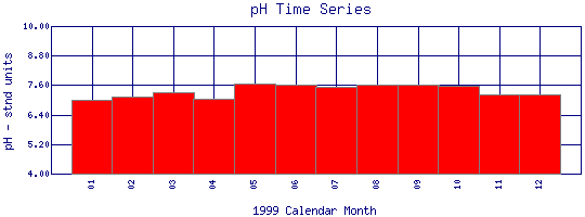 measures hydrogen concentration in water. pH is presented on a scale from 0 to 14. A solution with a pH value of 7 is neutral; a solution with a pH value less than 7 is acidic; a solution with a pH value greater than 7 is basic. Natural waters usually have a pH between 6 and 9. The scale is negatively logarithmic, so each whole number (reading downward) is ten times the preceding one (for example, pH 5.5 is 100 times as acidic as pH 7.5). The pH of natural waters can be made acidic or basic by human activities. For example, coal-burning power plants and heavy automobile traffic can produce nitrous oxides and sulfur dioxide, making the rain and snow highly acidic. |