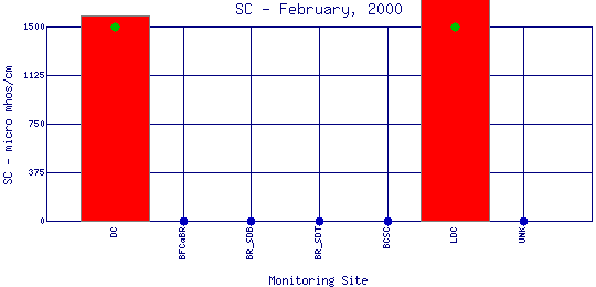 Specific Conductance is a measure of how well water can pass an electrical current. It is an indirect measure of the presence of inorganic dissolved solids, such as chloride, nitrate, sulfate, phosphate, sodium, magnesium, calcium, and iron. These substances conduct electricity because they are negatively or positively charged when dissolved in water. The concentration of dissolved solids, or the conductivity, is affected by the bedrock and soil in the watershed. It is also affected by human influences. For example, agricultural runoff can raise conductivity because of the presence of phosphate and nitrate.