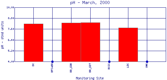 pH measures hydrogen concentration in water. pH is presented on a scale from 0 to 14. A solution with a pH value of 7 is neutral; a solution with a pH value less than 7 is acidic; a solution with a pH value greater than 7 is basic. Natural waters usually have a pH between 6 and 9. The scale is negatively logarithmic, so each whole number (reading downward) is ten times the preceding one (for example, pH 5.5 is 100 times as acidic as pH 7.5). The pH of natural waters can be made acidic or basic by human activities. For example, coal-burning power plants and heavy automobile traffic can produce nitrous oxides and sulfur dioxide, making the rain and snow highly acidic.