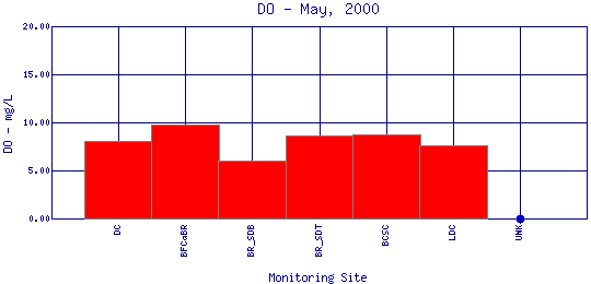 Dissolved Oxygen (DO) is the amount of oxygen dissolved in the water. DO is a very important indicator of a water body's ability to support aquatic life. The amount of DO in water depends on several factors, including temperature (the colder the water, the more oxygen can be dissolved); the volume and velocity of water flowing in the water body; and the amount of organisms using oxygen for respiration. The amount of oxygen dissolved in water is expressed as a concentration, in milligrams per liter (mg/l) of water. The optimal DO for adult brown trout is 9-12 mg/l. Human activities that affect DO levels include the removal of riparian vegetation, runoff from roads, and sewage discharge.