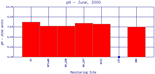 pH measures hydrogen concentration in water. pH is presented on a scale from 0 to 14. A solution with a pH value of 7 is neutral; a solution with a pH value less than 7 is acidic; a solution with a pH value greater than 7 is basic. Natural waters usually have a pH between 6 and 9. The scale is negatively logarithmic, so each whole number (reading downward) is ten times the preceding one (for example, pH 5.5 is 100 times as acidic as pH 7.5). The pH of natural waters can be made acidic or basic by human activities. For example, coal-burning power plants and heavy automobile traffic can produce nitrous oxides and sulfur dioxide, making the rain and snow highly acidic.
