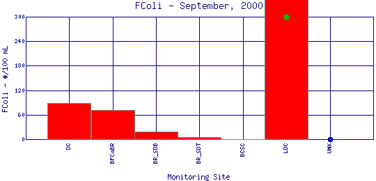 The above map indicates water quality monitoring sites. To view data at a specific site select it from the map with the mouse.